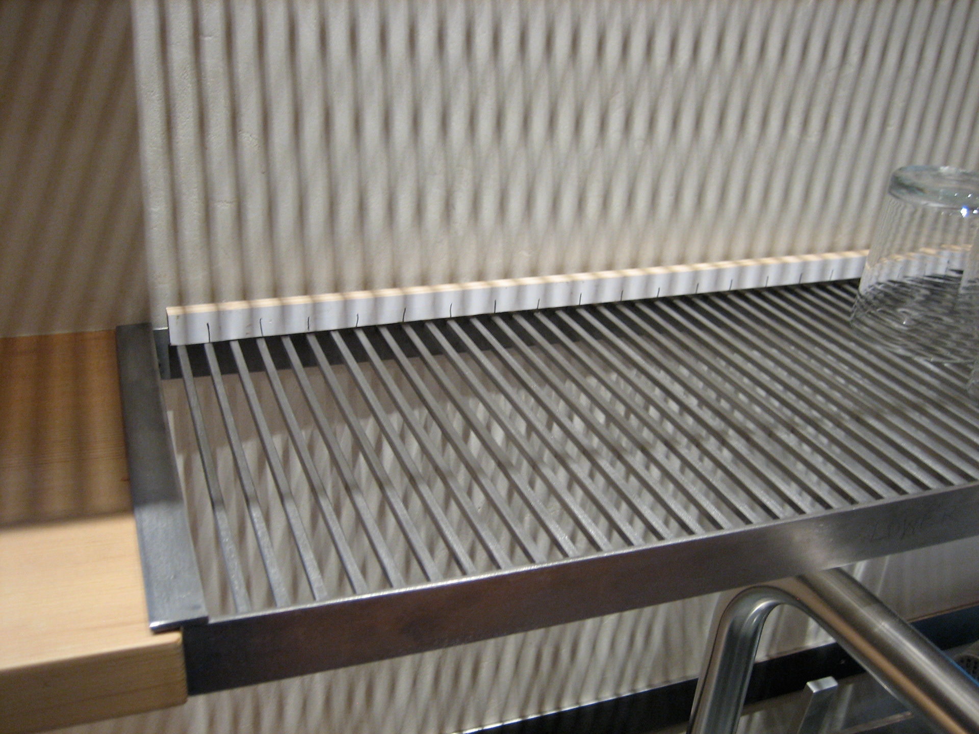 This elegant custom-brushed stainless steel dish drying rack integrated into open shelving, allowing dishes to drip-dry directly into sink below.